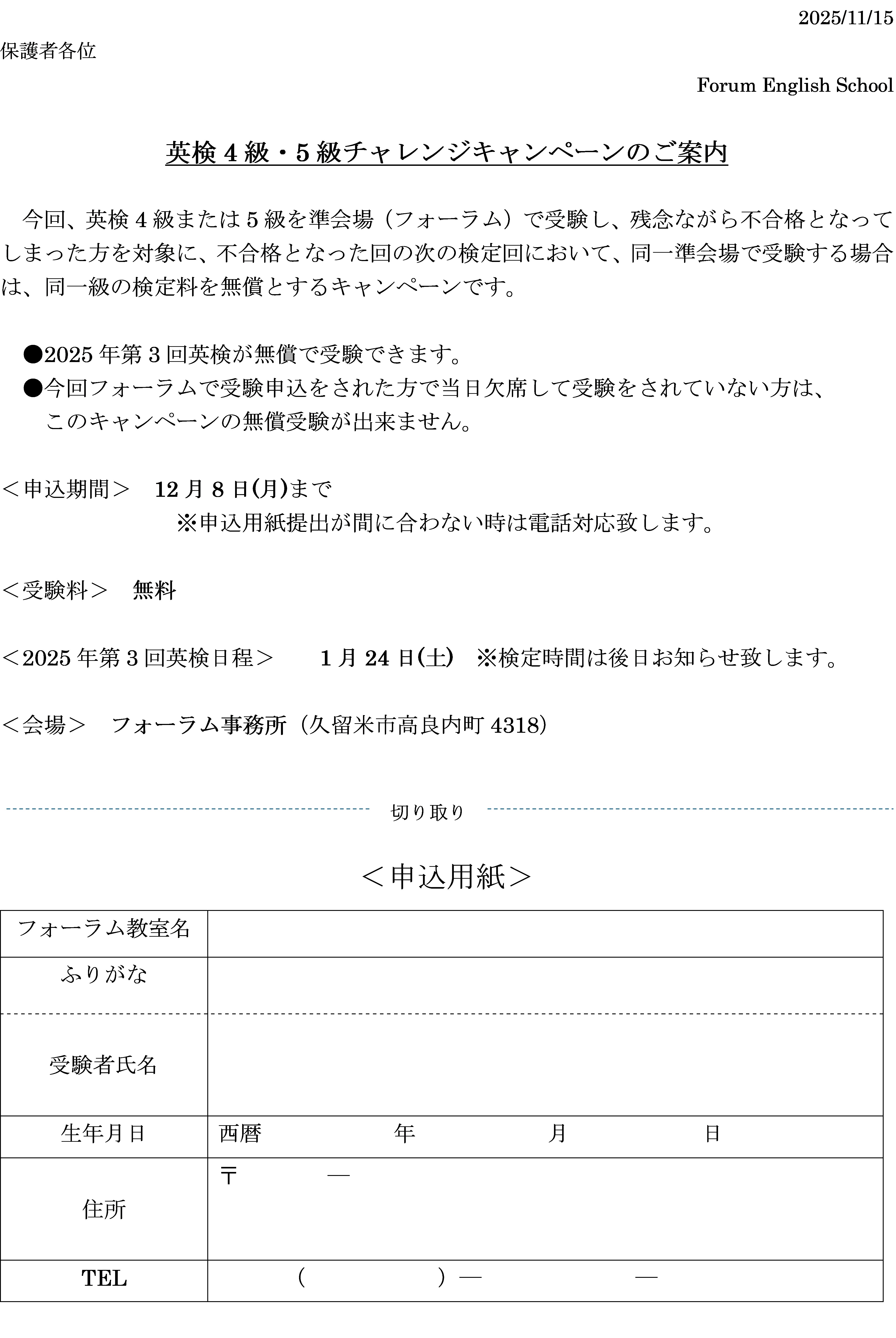 今回、英検4級または5級を順会場(フォーラム)で受験し、残念ながら不合格となってしまった方を対象に、不合格となった回の次の検定回において、同一準会場で受験する場合は、同一級の検定科を無償とするキャンペーンです。